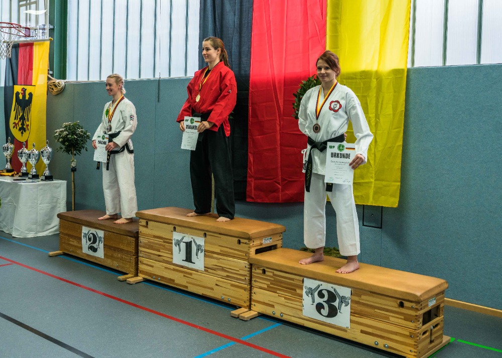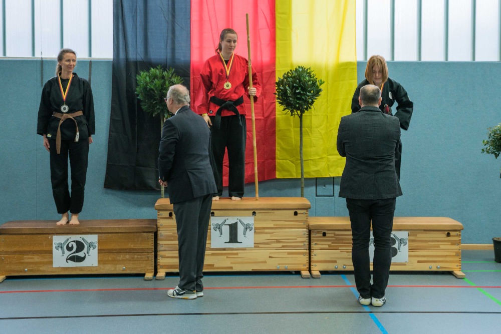 Bei den Waffenkatas gingen Tina Unglaub, Bianca Lange und Marina Bruchmann an den Start. Tina Unglaub konnte hier ihre ersten Turniererfahrungen sammeln und den Kampfrichtern souverän ihre Langstock Form präsentieren, mit der sie den vierten Platz erreichte. Bianca und Marina konnten an ihre guten Leistungen im Kata Bereich anknüpfen. Bianca sicherte sich den Titel der Deutschen Vizemeisterin und Marina den der Deutschen Meisterin.