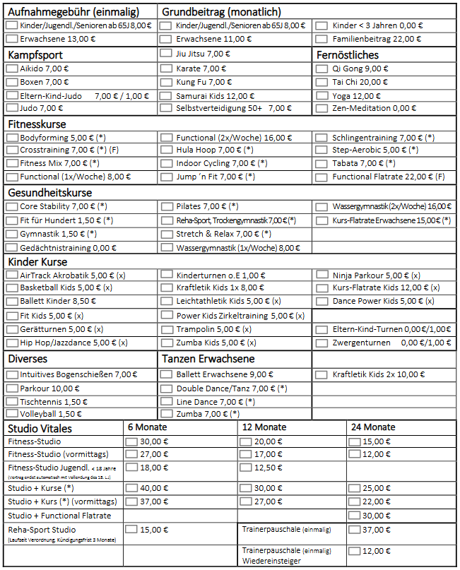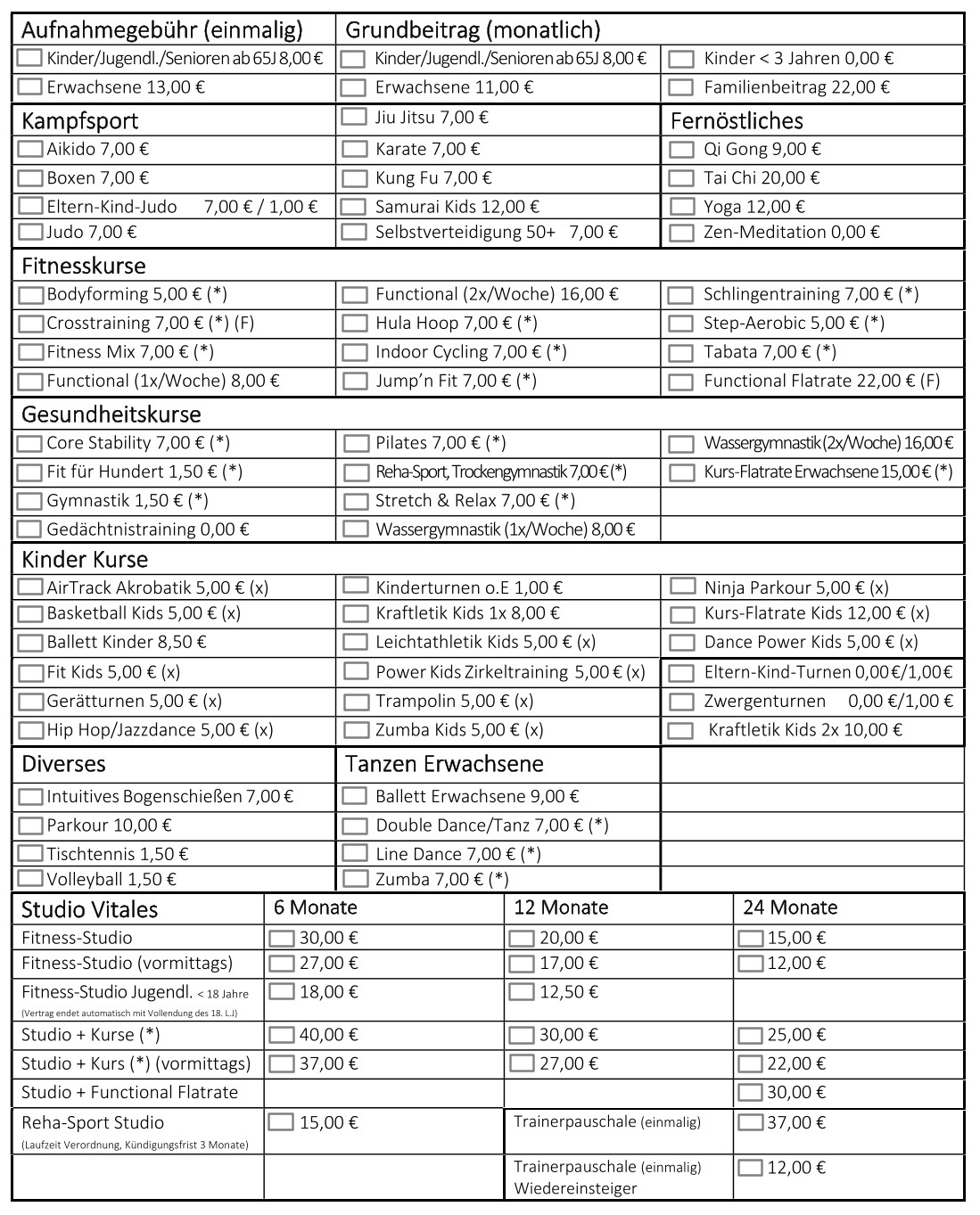 Die Beiträge findest du im Online-Aufnahmeantrag bei den jeweiligen Sportarten oder in der nachfolgenden Übersicht.